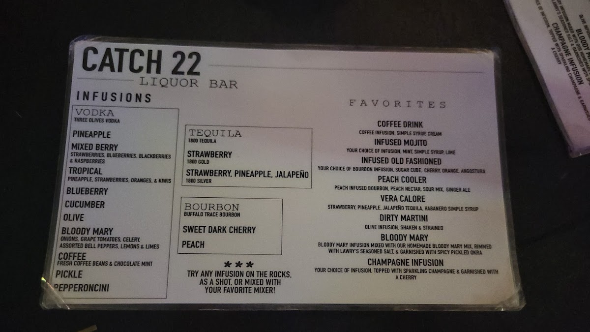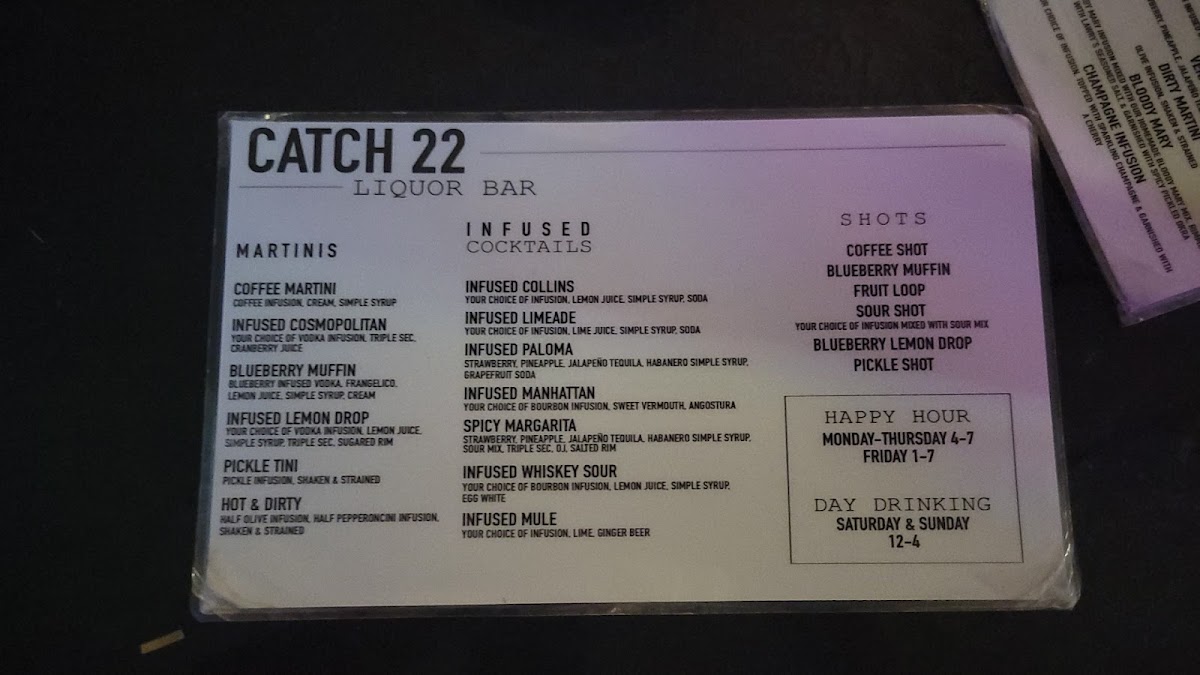 Catch 22 offers a thoughtfully curated cocktail menu that strikes a balance between crafted infusions and classic favorites. The selection leans into approachable yet distinctive drinks, perfect for those seeking thoughtfully mixed cocktails in a relaxed, welcoming environment.